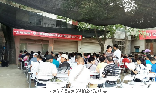為進(jìn)一步推進(jìn)浐河?xùn)|岸“五建花苑”職工住房項(xiàng)目建設(shè),保障拆除安置工作平穩(wěn)有序高效進(jìn)行。2017年7月14日,職工服務(wù)中心在原五公司木材廠(28畝地)召開(kāi)了五建花苑項(xiàng)目建設(shè)暨拆除動(dòng)員現(xiàn)場(chǎng)會(huì)?,F(xiàn)場(chǎng)會(huì)邀請(qǐng)了90余戶住戶及西建五公司領(lǐng)導(dǎo)出席參加。