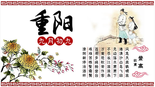 重陽節(jié)是中華民族的傳統(tǒng)節(jié)日,《易經(jīng)》中把“六”定為陰數(shù),把“九”定為陽數(shù),九月九日,日月并陽,兩九相重,故曰重陽,也叫重九。慶祝重陽節(jié)一般包括出游賞秋、登高遠(yuǎn)眺、觀賞菊花、遍插茱萸、吃重陽糕、飲菊花酒等活動(dòng)。1989年農(nóng)歷九月九日被定為老人節(jié),倡導(dǎo)全社會(huì)樹立尊老、敬老、愛老、助老的風(fēng)氣。