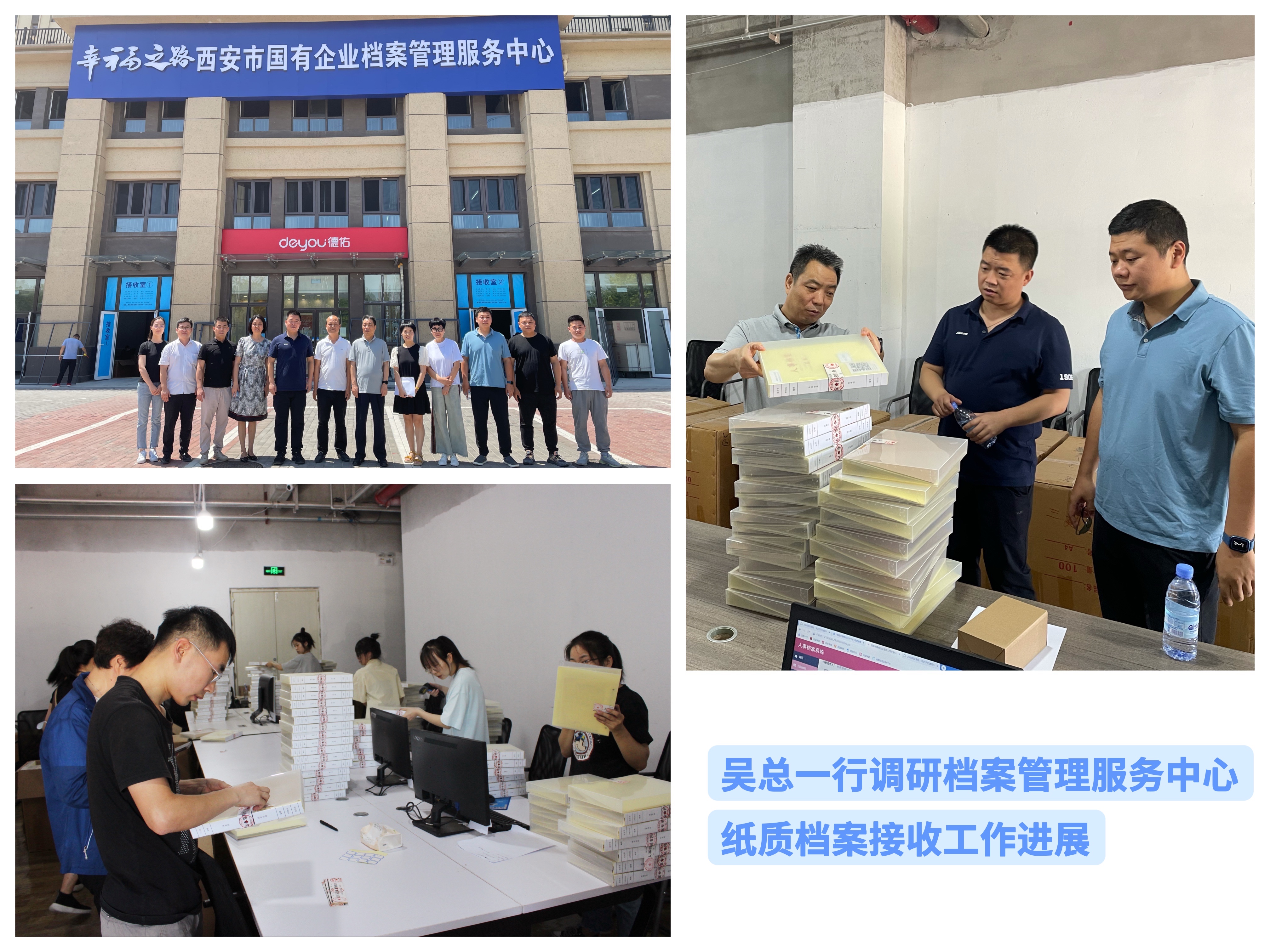 隨后,吳總一行前往“幸福之路”國(guó)有企業(yè)檔案管理服務(wù)中心調(diào)研慰問(wèn)。在工作人員陪同下,吳總一行參觀了檔案管理服務(wù)中心各功能區(qū),向前來(lái)辦理檔案移交的企業(yè)了解服務(wù)需求,并為現(xiàn)場(chǎng)工作人員發(fā)放了防暑降溫飲品。吳總強(qiáng)調(diào),檔案服務(wù)中心及紙質(zhì)檔案接收是當(dāng)前平臺(tái)工作的頭等大事,要加快館建配套設(shè)施,做好檔案交接托管服務(wù),充分利用好、發(fā)揮好“幸福之路”平臺(tái)的陣地作用,做好“幸福之路”平臺(tái)的宣傳推廣,為打造一流服務(wù)團(tuán)隊(duì)、豐富平臺(tái)服務(wù)功能和業(yè)務(wù)拓展外延打下堅(jiān)實(shí)基礎(chǔ)。